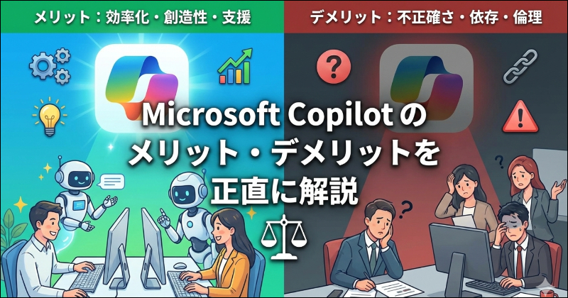 Microsoft Copilotのメリット・デメリットを徹底解説。業務効率化や生産性向上の効果から、正確性の限界やコスト面の注意点まで、導入前に知っておくべき情報を網羅的にまとめました。
